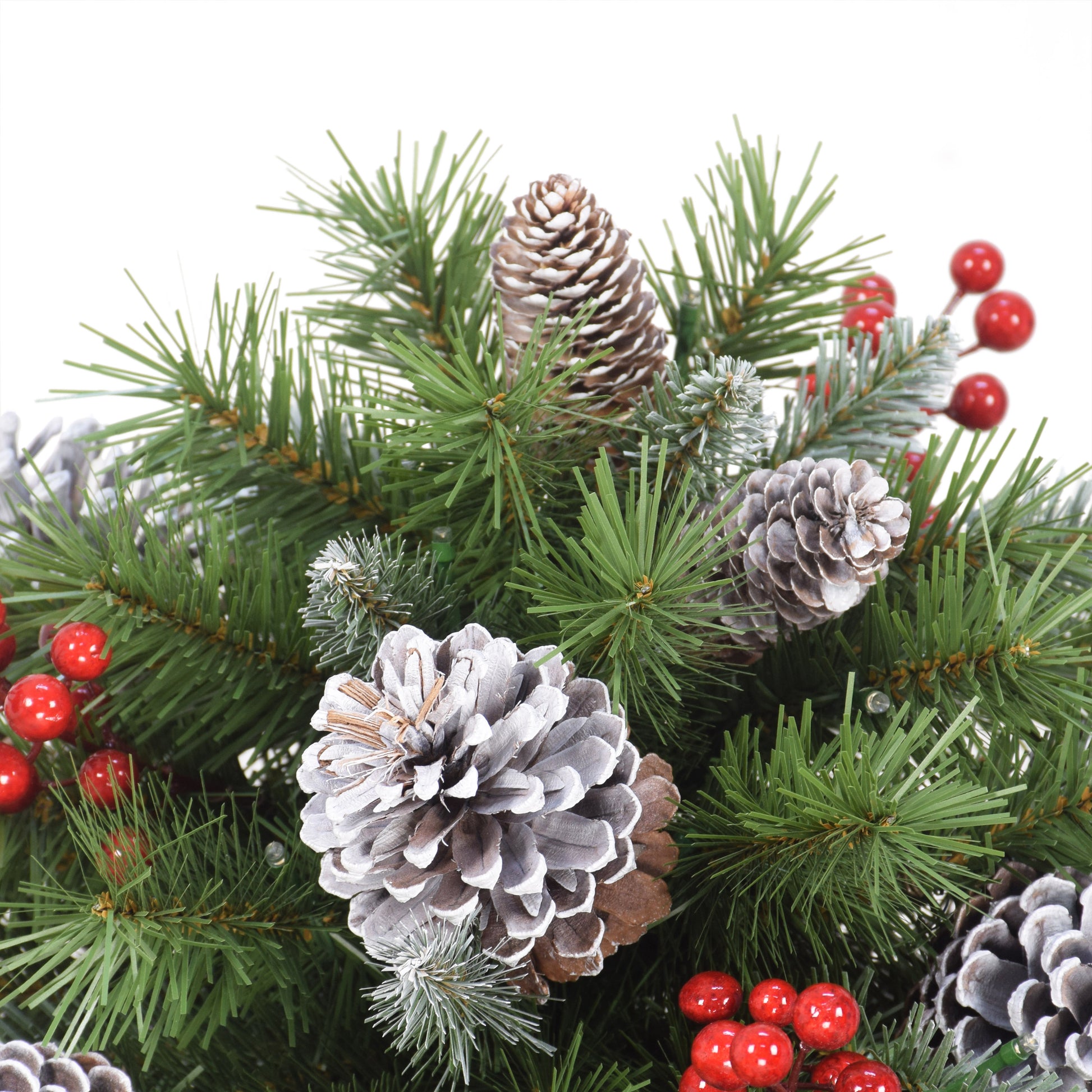 Get into the holiday spirit with the Puleo International Urn Filler. This 18-inch tall bundle of greenery with verdant green pine needles, rich-colored berries, and realistic snow-covered pine cones makes for the perfect inhabitant of your favorite festive urn and perfectly captures the ambiance of the wintry forests in your home. Decorated with 35 pre-attached warm white LED lights, this pre-lit foliage illuminates your home with a dazzling festive glow while eliminating the time-consuming hassle of hanging lights around your house. Powered by three AA batteries (batteries sold separately), this pre-lit urn-filling greenery illuminates your home with a dazzling festive glow, and the timer function conveniently allows you to set a 6 or 18 hour lights-on period. The urn filler has a full and natural appearance with a total of 62 PE/PVC branch tips, gorgeous life-like branches, and a classic conical shape for an authentic wintry forest impression. Assembly is simple and quick-- simply secure into the urn of your choosing with the three sturdy stakes, and flip the lights on to supply a near-instant pop of holiday joy! The hypoallergenic and needle-shed resistant branches offer a safer alternative to fresh-cut Christmas greenery, so you can welcome in friends and family for holiday celebrations without worry. This product is backed by a five-year warranty for years of quality use.