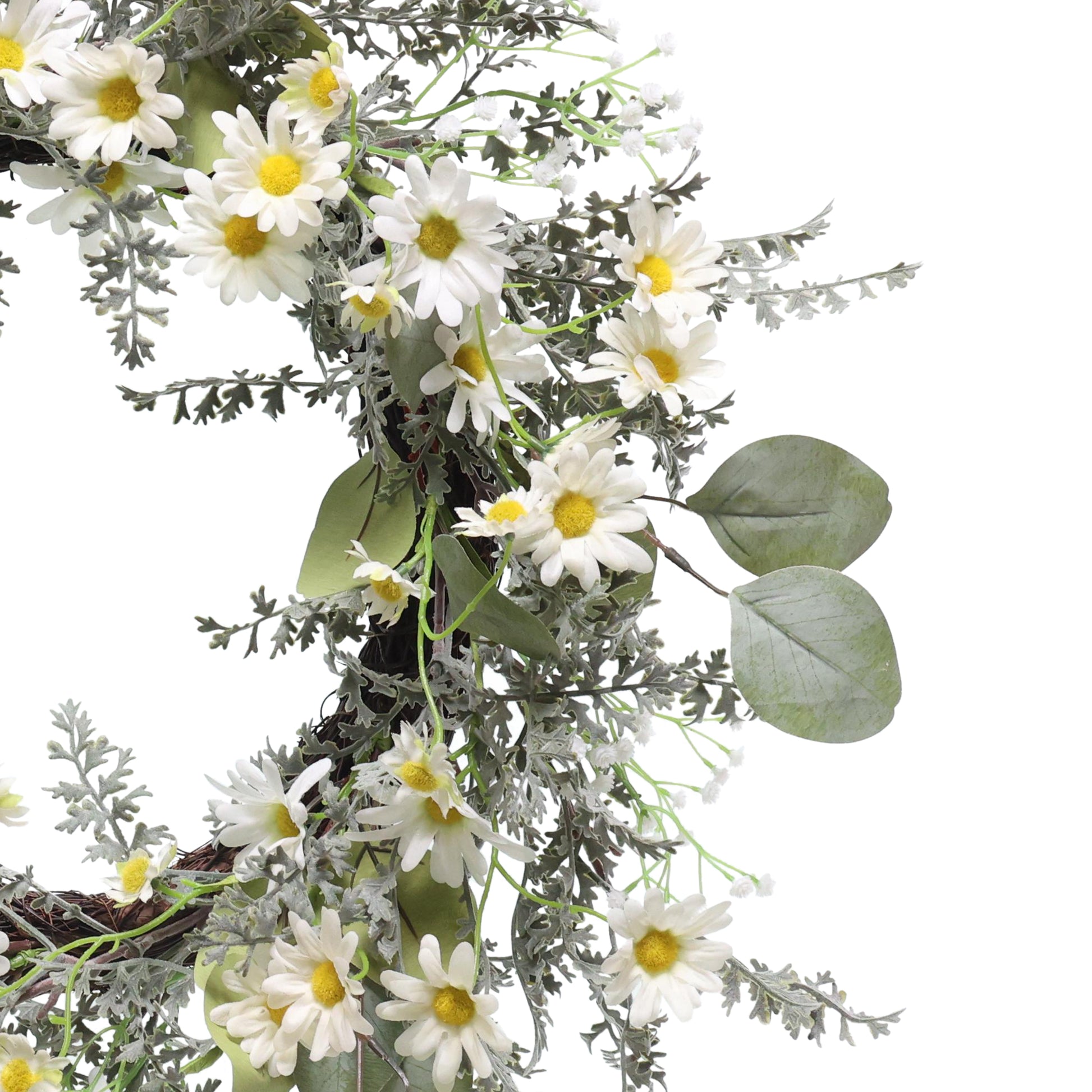 Radiate springtime cheer with the Puleo International 24" Artificial Daisy Floral Spring Wreath. Crafted from a resilient polyester blend, this wreath features lush green leaves and delicate white daisy blooms that will never wilt or fade. This beautiful wreath is the perfect way to welcome spring into your home. Hang it on your front door to greet guests with a cheerful display, or place it on a wall or mantle to infuse your space with the spirit of the season. Upgrade your decor and enjoy the beauty of nature all year long.