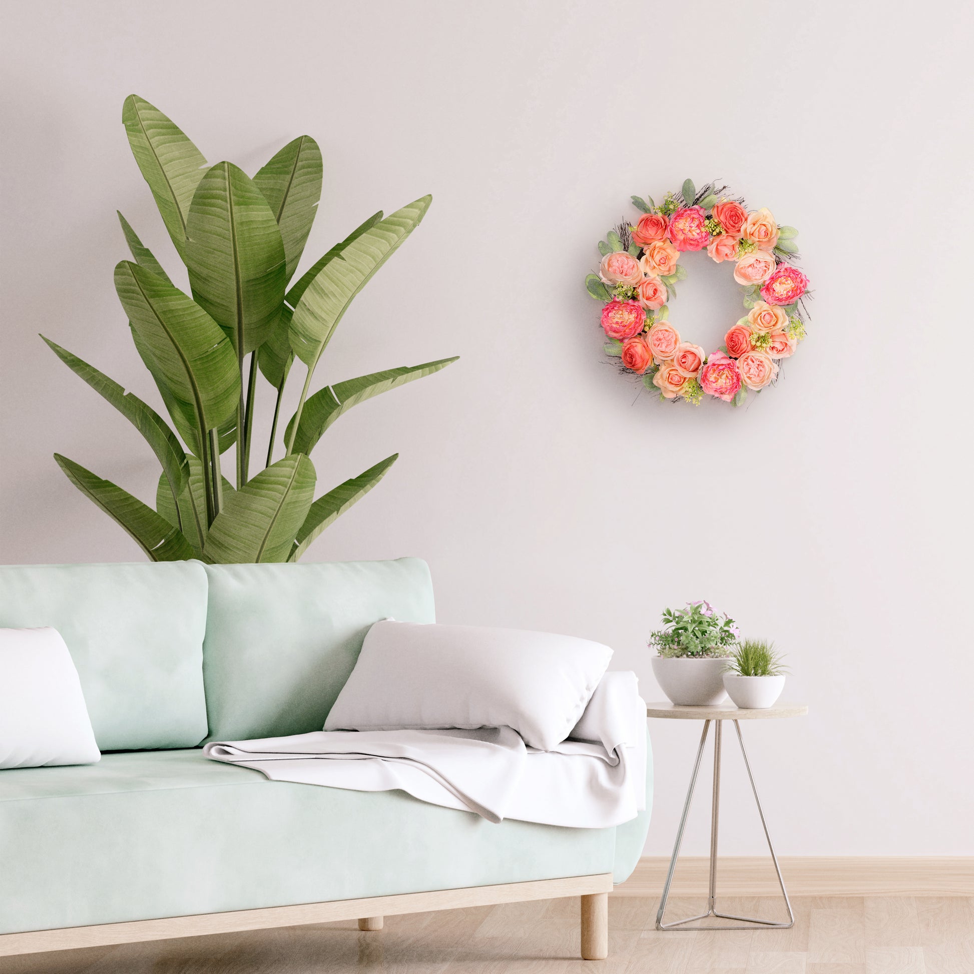 Bask in the colorful beauty of the spring and bring that positive energy to your home decor with the Puleo International Floral Spring Door Wreath. Enchanting and chic, this faux wreath is covered with ethereal and vibrant pink peony and rose flowers that will always look as though they were just plucked from the garden! The florals are beautifully accented by a stylish faux brown twig frame and generous coverage of leaves and greenery that fabricate a convincingly natural appearance. Flame-retardant and non-allergenic, this inviting spring decoration can be mounted and displayed either inside your home on the wall or above a window or in a covered area outdoors as a welcoming front door or patio accent. This round artificial spring wreath measures 24 inches in diameter for a delicate and complimentary accent to your farmhouse, rustic, traditional, transitional, country, and coastal decor.
