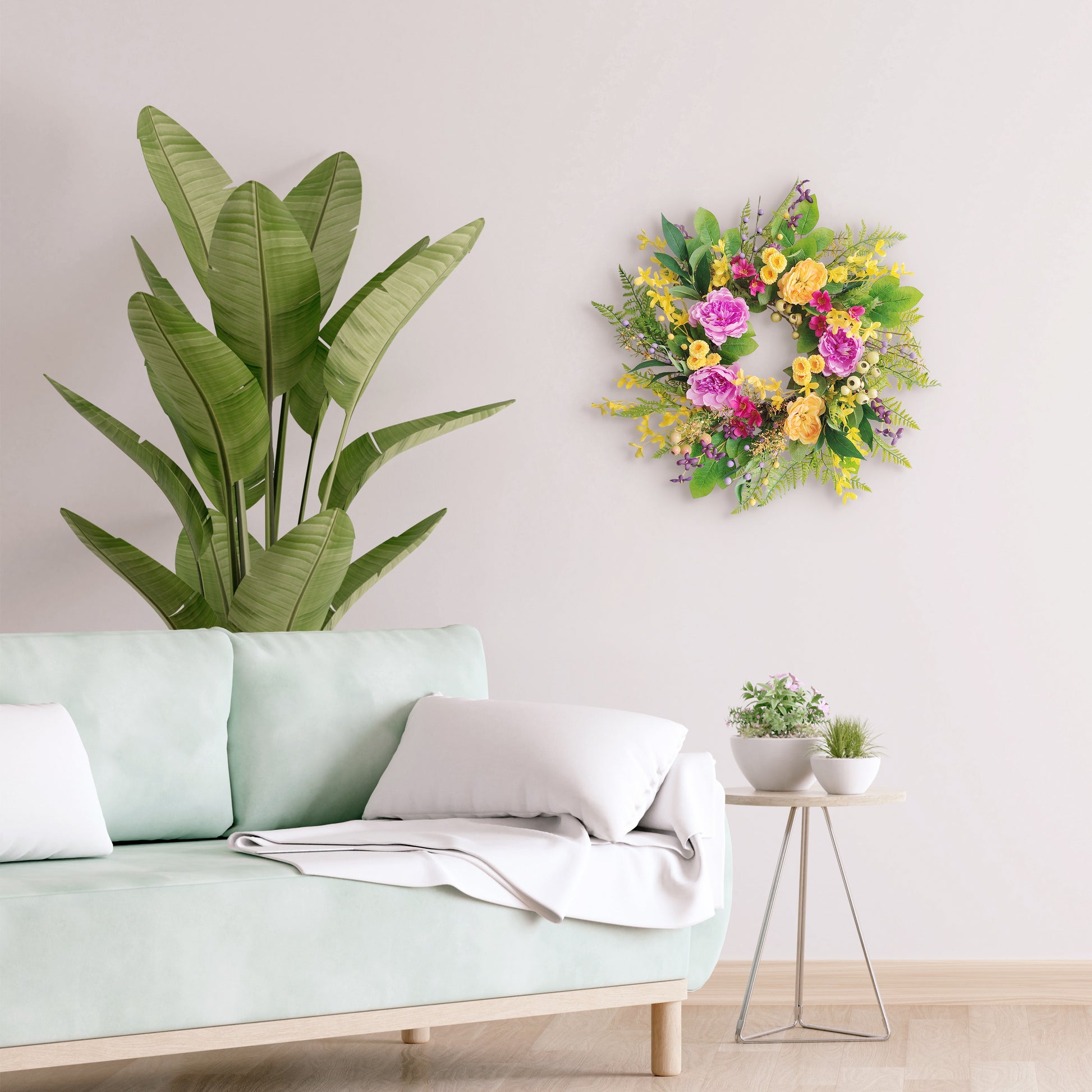 The Puleo International 24" Artificial Peony & Winter Jasmine Floral Spring Wreath is perfect for those who want to add a touch of nature-inspired elegance to their home, without the hassle of caring for live plants. Its vibrant, realistic design makes it an eye-catching centerpiece that's sure to impress your guests.