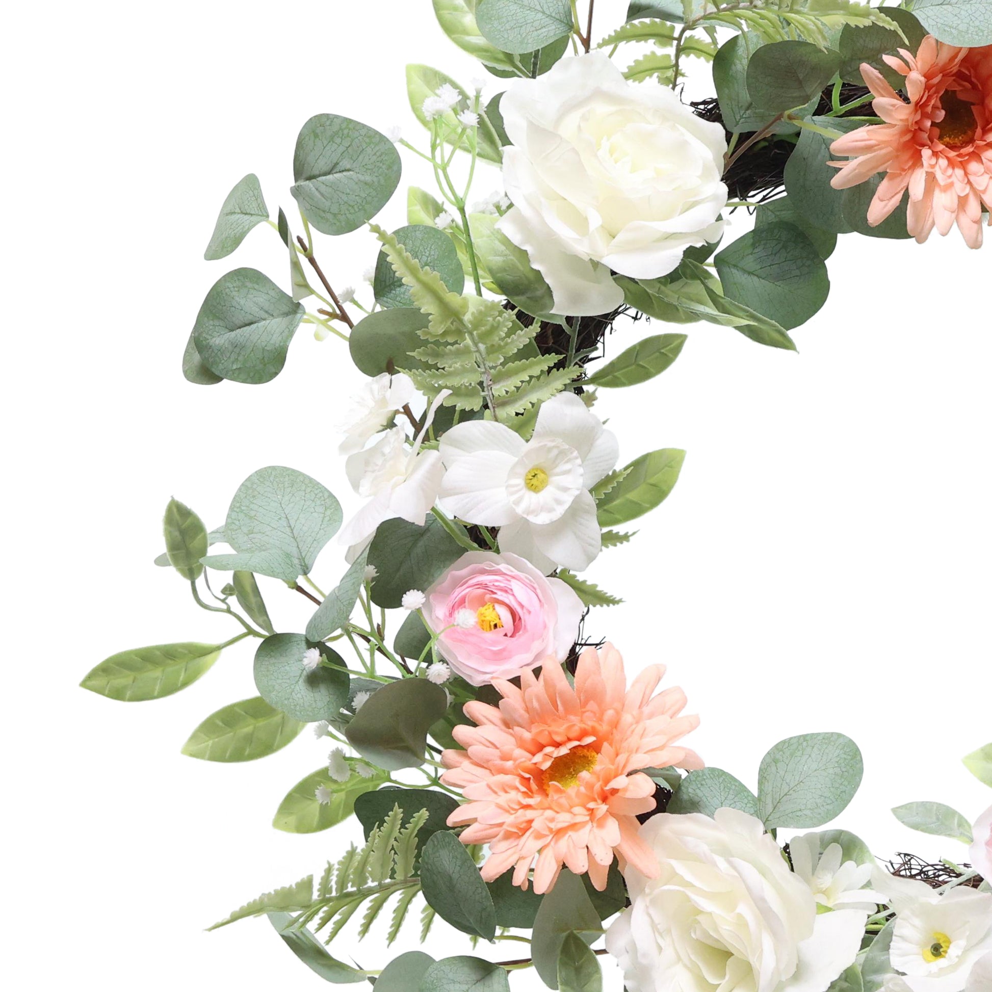 Refresh your space with the Puleo International 24" Artificial Chrysanthemum Rose & Ranunculus Floral Spring Wreath. Crafted with a captivating blend of lifelike pink, white, and green polyester blooms, this wreath will transport you to a vibrant spring garden. This stunning floral wreath is the perfect way to welcome the new season. Its lush, colorful design will instantly brighten up your home, creating an inviting and cheerful atmosphere. Whether you display it proudly on your front door or hang it as a beautiful accent piece, this wreath is sure to impress guests and lift your spirits every time you see it. Treat yourself or a loved one to this beautiful piece of spring decor that will bring the vibrant colors of the season into your space.