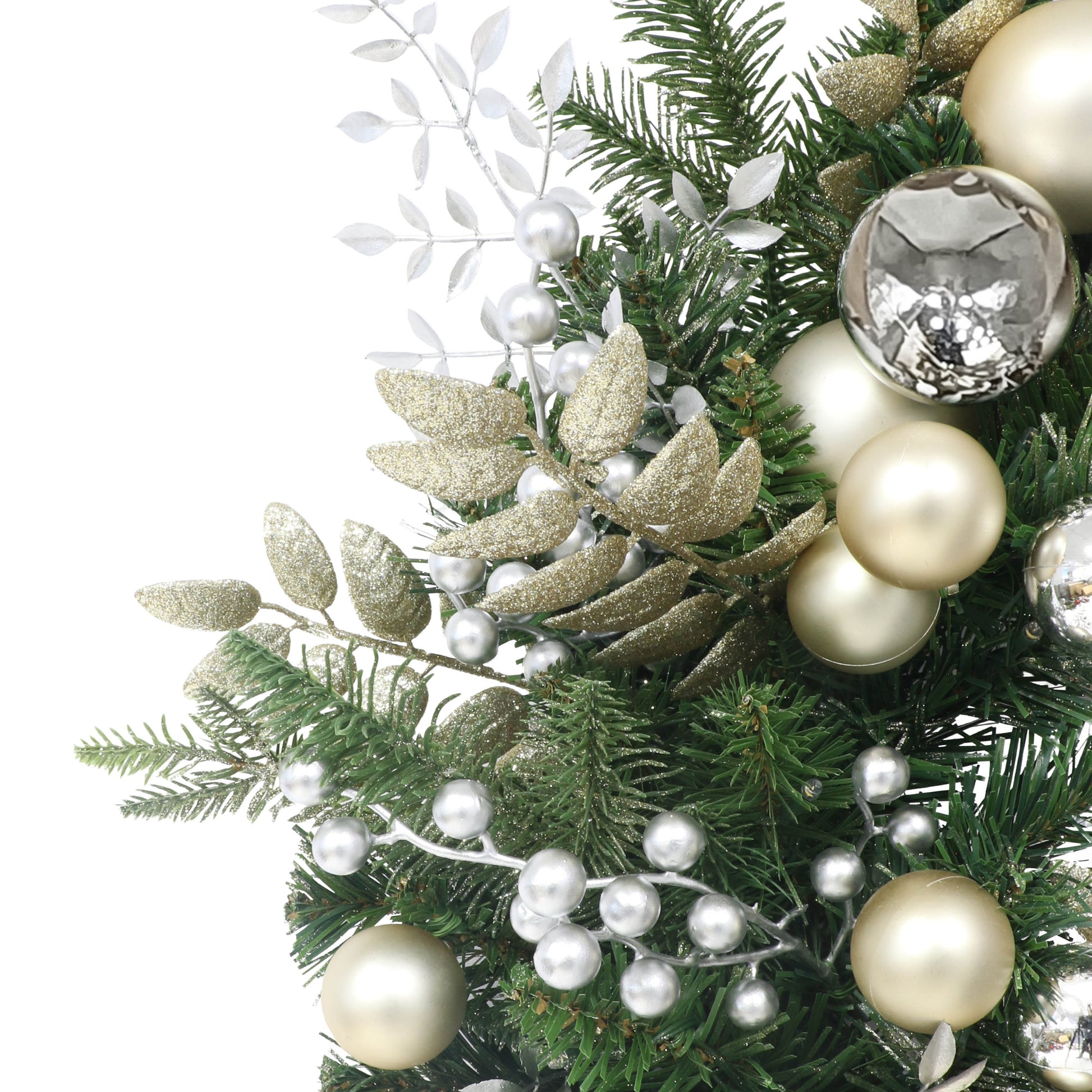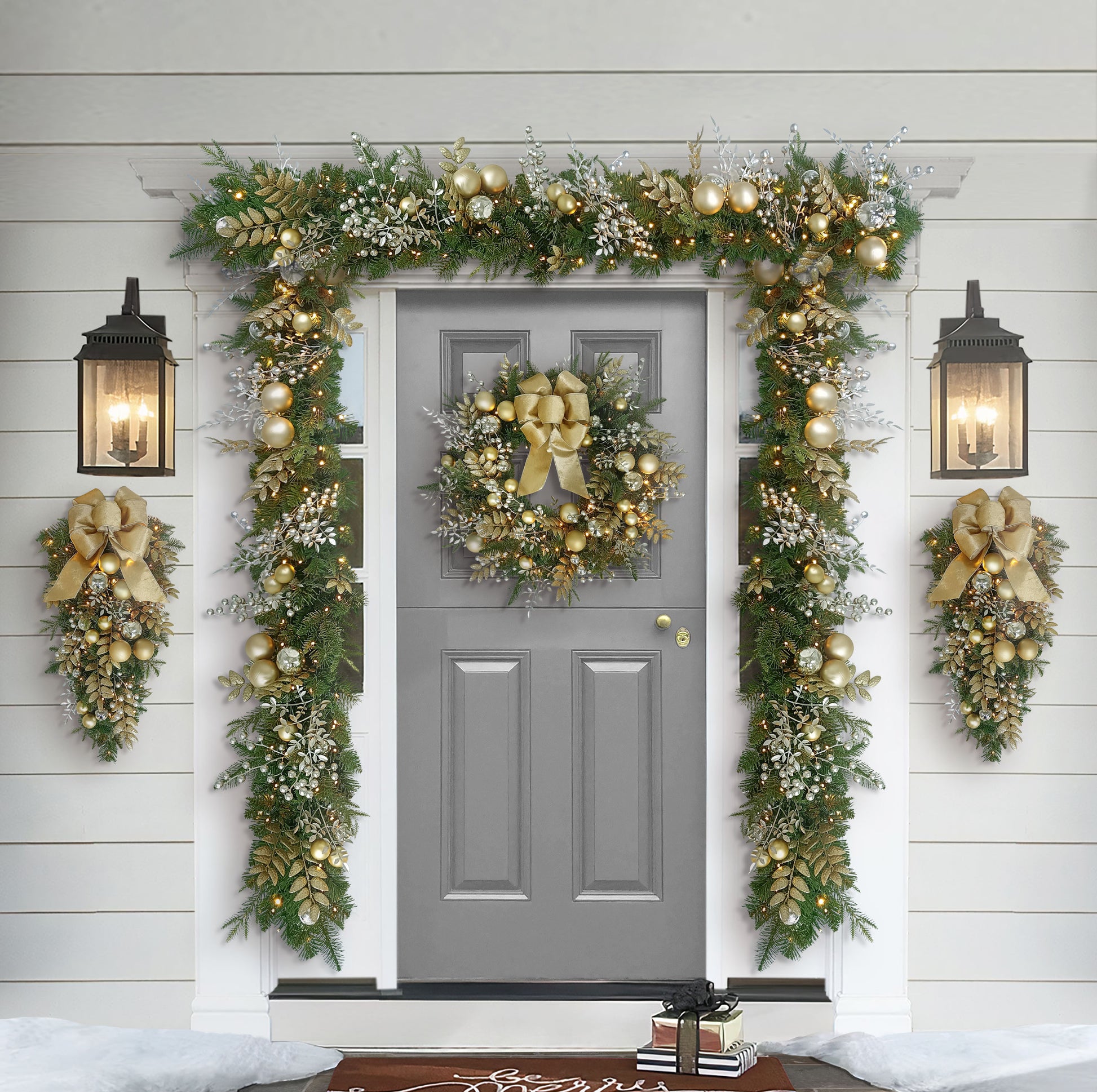 Add elegance to your home with the Puleo International 26” pre-lit decorated wreath. Adorned with champagne balls, silver balls, gold leaves, silver leaves and berries, this beautiful garland brings the Christmas spirit to your front door or inside your home. The 80 warm white LED lights will brighten your display for extra enjoyment. This wreath is battery-operated and requires 3 D batteries (not included). It has an 8/16 hour on/off timer switch for your easy use and convenience. No need to worry about turning the lights on or off at night. The wreath is part of Puleo’s elegant Canterbury Collection with a matching swag and garland to complete the festive look in your home during the holiday season!