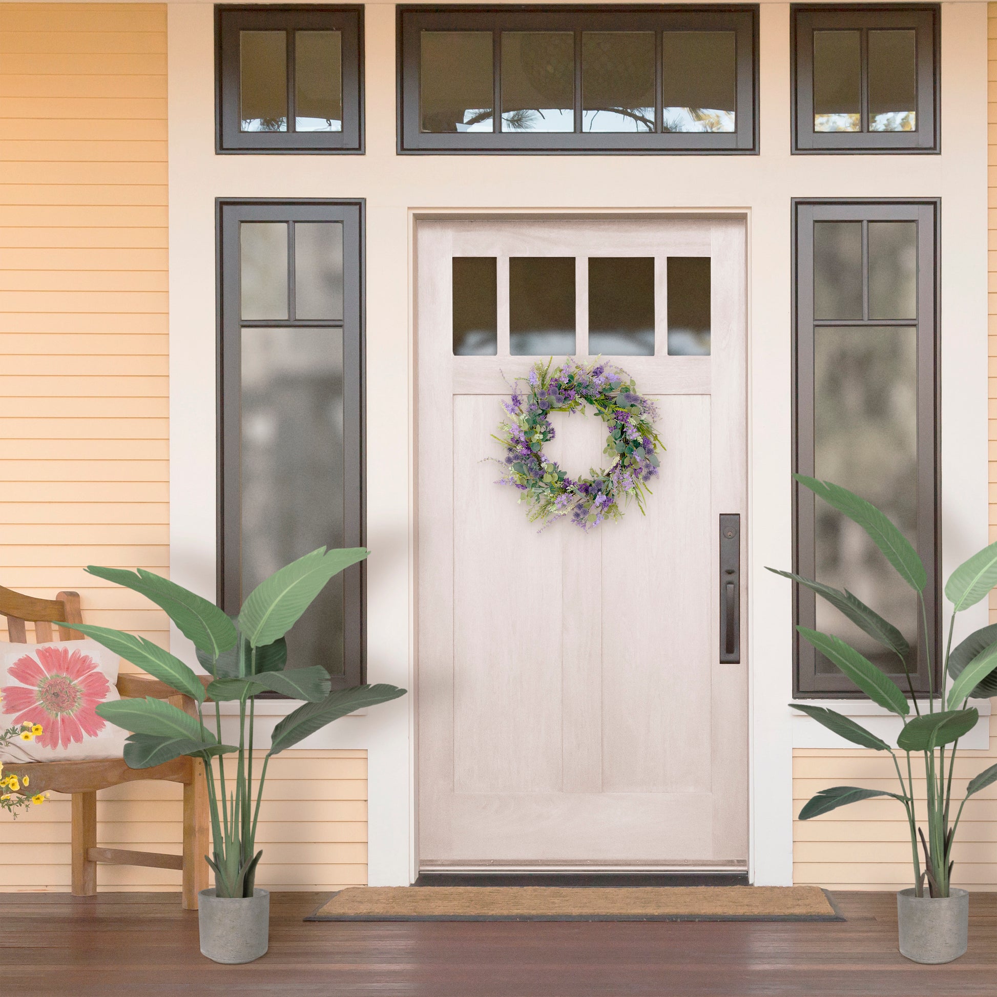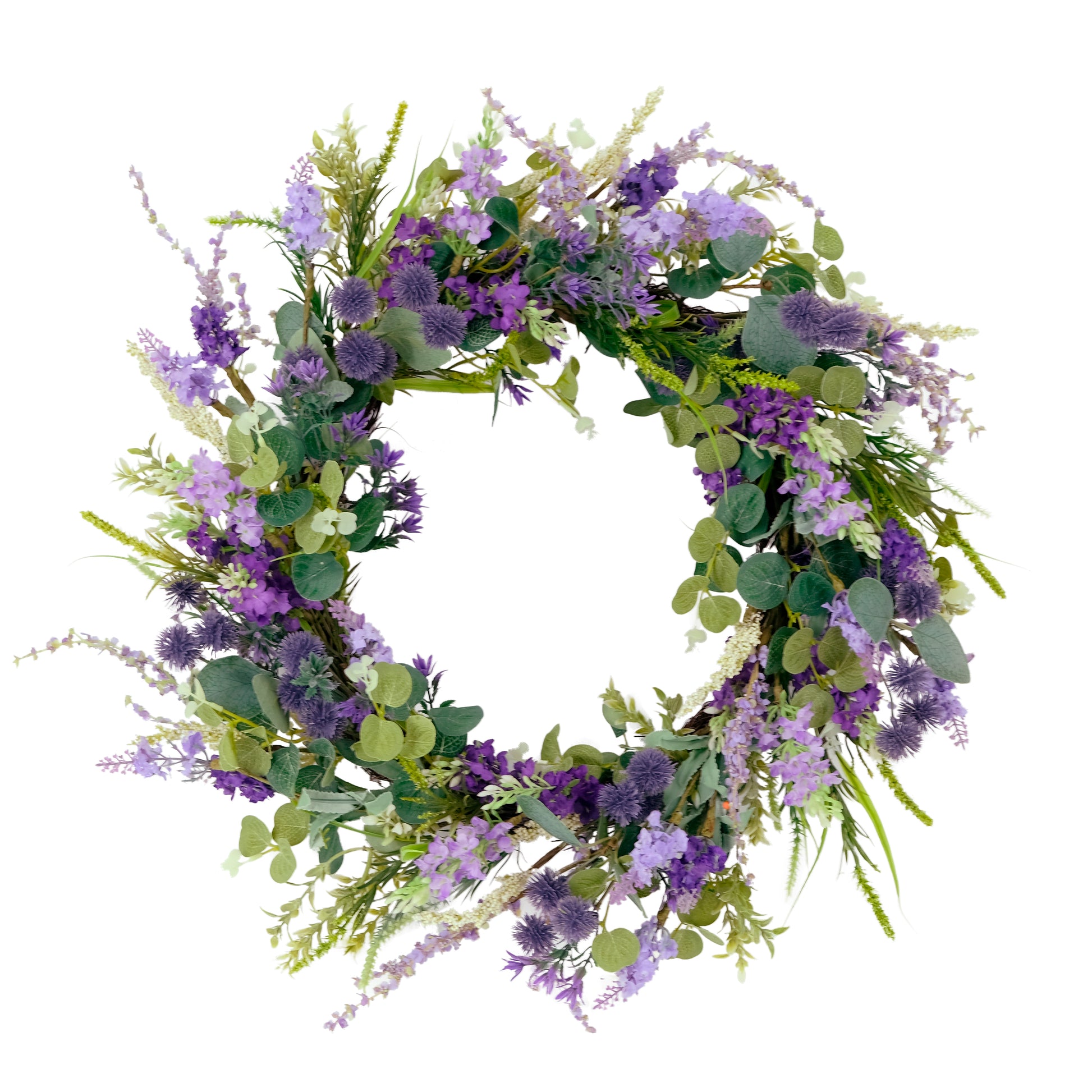 Bask in the colorful beauty of the spring and summer seasons, and bring that positive energy to your home decor with the Puleo International Echinops Floral Wreath. Enchanting and chic, this faux wreath is covered with soft and ethereal echinops flowers in various shades of purple, accented by a faux brown twig ring frame and a generous coverage of leaves and greenery that fabricates a convincingly natural appearance. The artificial echinops and other floral accents will always look as though they were just plucked from the garden! This fresh all-season decoration is flame-retardant and non-allergenic, so it can be displayed either inside your home on the wall, above your windows, or in a covered area outdoors- including mounted on your front door as a colorful accent to your pergola-covered patio. This artificial round floral wreath measures 24 inches in diameter with a 5.5-inch width, a delicate and complimentary centerpiece or accent to your farmhouse, rustic, traditional, transitional, country, and coastal decor.