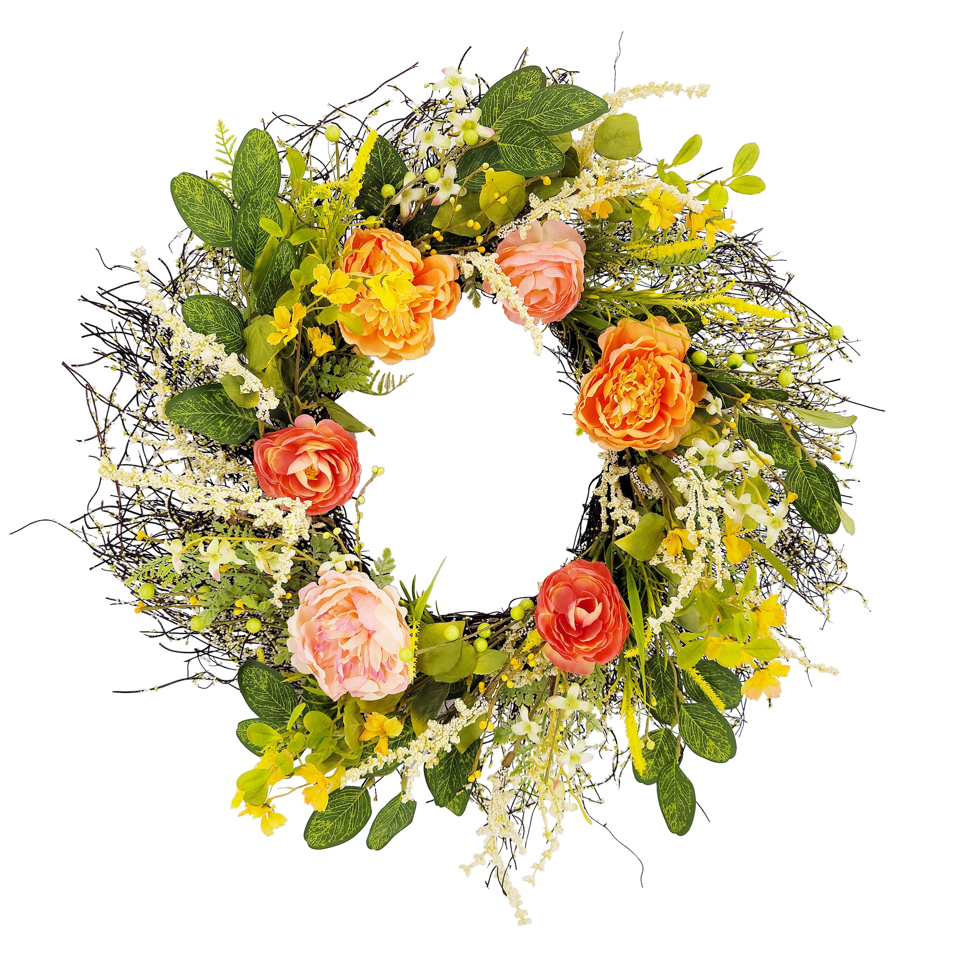 Bask in the colorful beauty of the spring and summer seasons, and bring that positive energy to your home decor with the Puleo International Peony Floral Wreath. Enchanting and chic, this faux wreath is covered with ethereal and vibrant orange, red, and pink peony flowers, accented by a faux brown twig ring frame and a generous coverage of leaves and greenery that fabricates a convincingly natural appearance. The artificial peonies and other floral accents will always look as though they were just plucked from the garden! This fresh all-season decoration is flame-retardant and non-allergenic, so it can be displayed either inside your home on the wall, above your windows, or in a covered area outdoors- including mounted on your front door as a colorful accent to your pergola-covered patio. This artificial round floral wreath measures 24 inches in diameter with a 5.5-inch width, a delicate and complimentary centerpiece or accent to your farmhouse, rustic, traditional, transitional, country, and coastal decor.